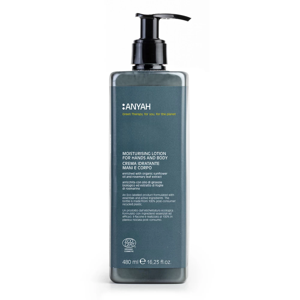 CREME HYDRATANTE CORPS ET MAINS, DANS UN FLACON RECYCLABLE DE 480 ML, CERTIFIE EU ECO LABEL, ANYAH