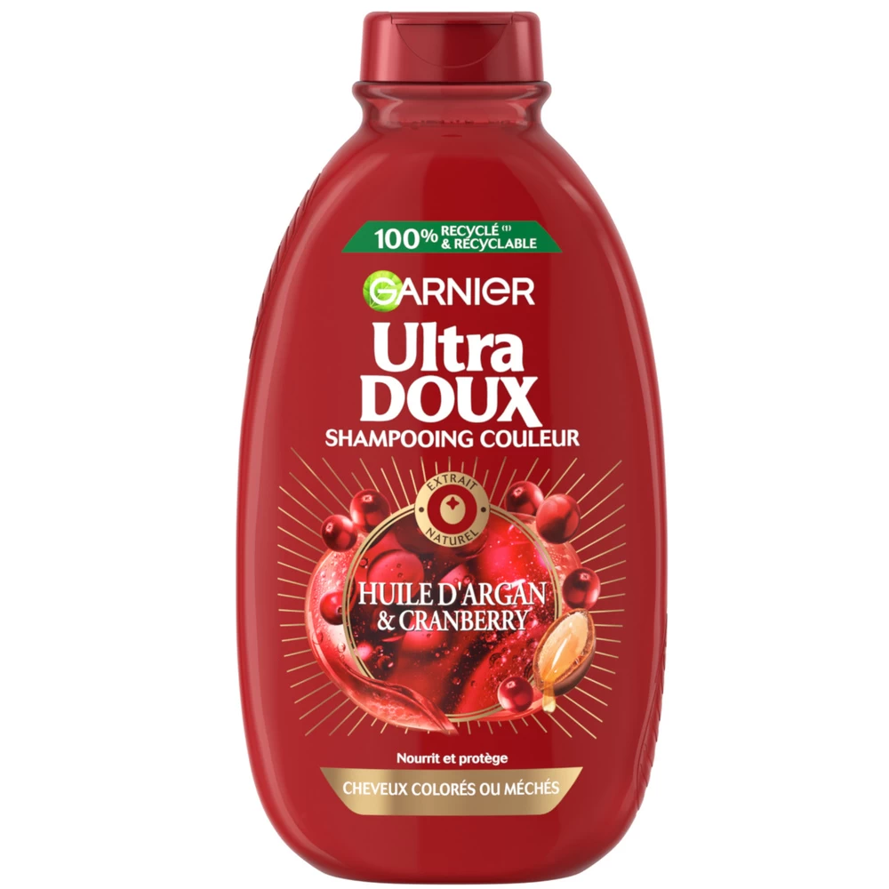 Shampooing Soin Garnier Ultra DOUX à l’Huile d’Argan et à la Cranberry pour nourrir et protéger les cheveux colorés ou méchés.