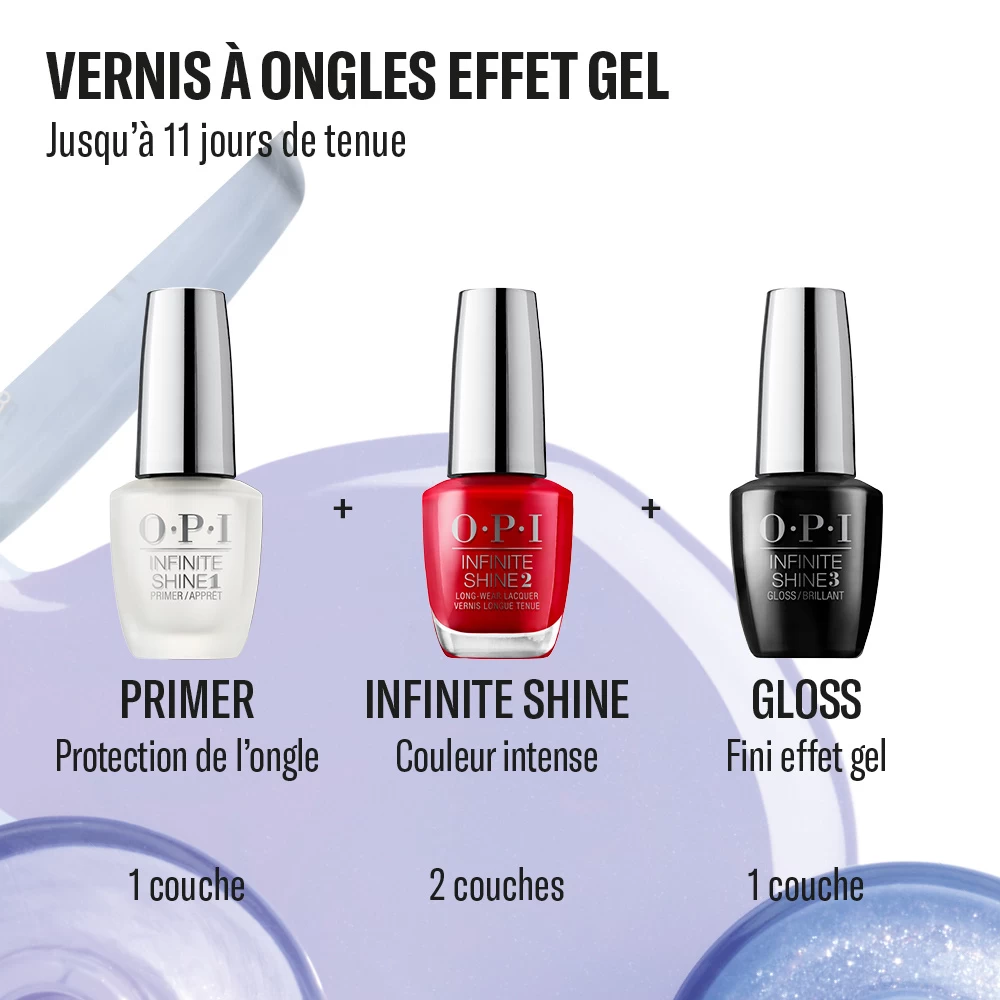 Infinite Shine est un système en 3 étapes. Pour des résultats optimaux, utilisez avec la base Infinite Shine et le Gloss top coat. Elle offre jusqu’à 11 jours de tenue et une brillance effet gel. Profitez d’une application simple sans lampe UV et d’un retrait facile avec un dissolvant classique.