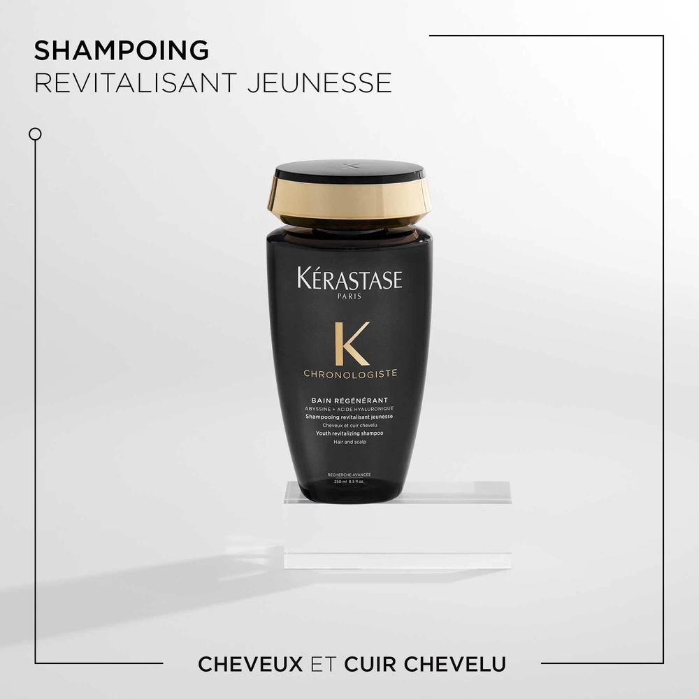 Le Bain Régénérant de Kérastase est un shampoing anti-âge pour tous types de cheveux. Il nettoie le cuir chevelu en profondeur, l’hydrate et le régénère. En renforçant la fibre, il l’homogénéise afin de rétablir sa densité. Les cheveux sont en pleine santé, leur éclat est renouvelé et leur toucher soyeux. Le Bain Régénérant est enrichi en acide hyaluronique, actif star des soins de la peau, qui hydrate le cheveu en profondeur afin de le gainer et de lui redonner souplesse et vitalité. Grâce à cet ingrédient, ce shampoing régénérant de Kérastase unifie et renforce la fibre capillaire. L’abyssine, molécule permettant de consolider le cheveu, dispose de vertus régénérantes. Enfin, la vitamine E protège le cuir chevelu des agressions quotidiennes comme les UV ou la pollution. Simple d’utilisation, le Bain Régénérant est un shampoing doux qui peut être appliqué tous les jours, tout au long de l’année. Le shampoing anti-âge de Kérastase agit sans alourdir les cheveux. Il les laisse légers et pleins de vitalité. Le Bain Régénérant appartient à la gamme Chronologiste de la marque Kérastase. Ce rituel de beauté est composé de produits qui agissent du cuir chevelu aux pointes pour apporter un soin capillaire anti-âge aux cheveux qui changent à travers le temps. Afin d’optimiser les bienfaits du shampoing, vous pouvez utiliser en complément le Masque Intense Régénérant. Ce masque pour cheveux affinés nourrit et lisse la fibre en profondeur. Vos cheveux sont sublimés et leur matière transformée.
