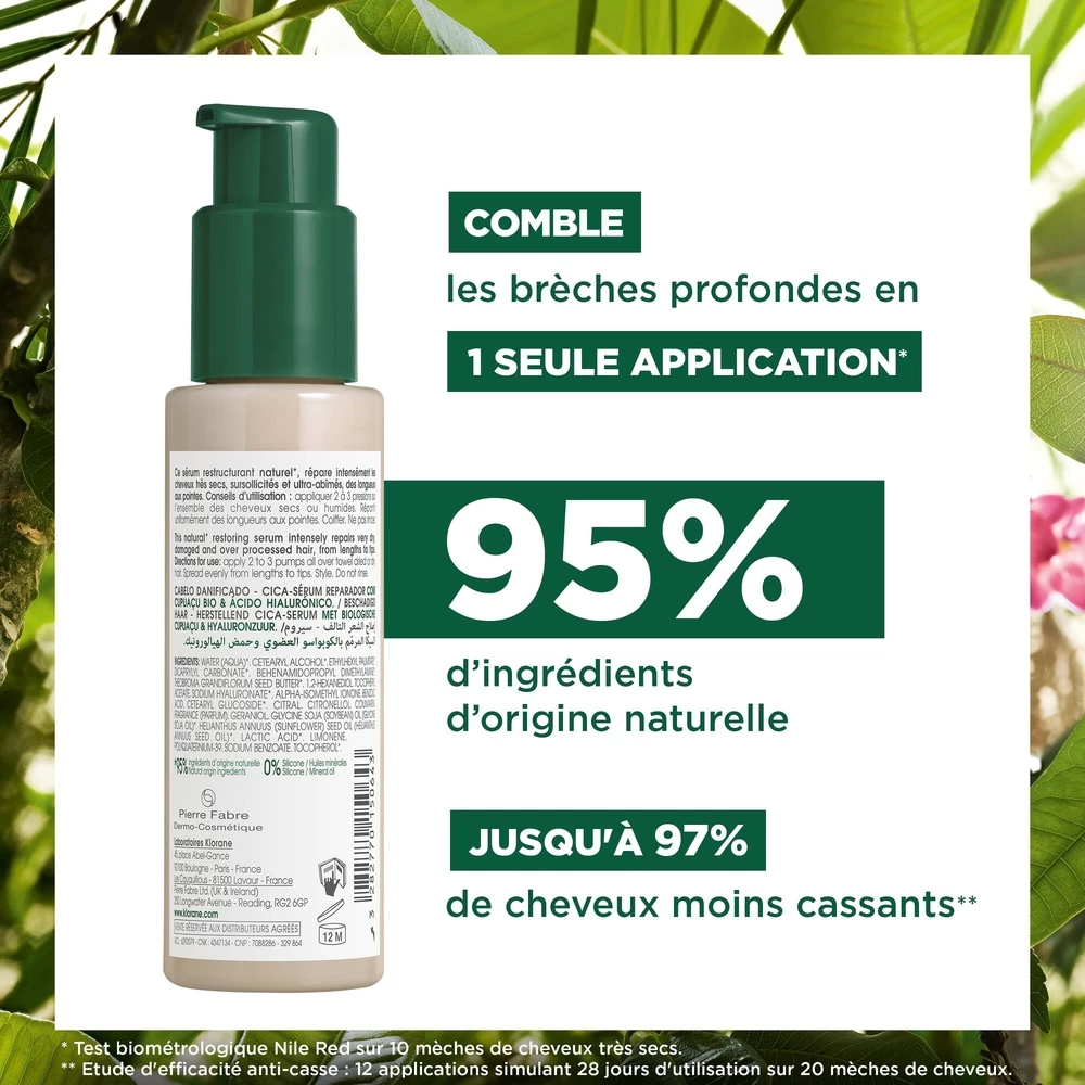 Le Cica-Sérum réparateur au Beurre de Cupuaçu BIO et acide hyaluronique répare et protège durablement les cheveux dès la première application*. Ce soin au fort pouvoir nutritif pénètre la fibre capillaire jusqu’au cortex pour une action réparatrice et protectrice en profondeur. S’utilise au moment du coiffage, en soin réparateur et thermo-protecteur à répartir des longueurs aux pointes, puis aussi souvent que nécessaire en retouches quotidiennes. Protège les cheveux de la chaleur jusqu’à 220°C*. *Tests biométrologiques ex-vivo sur mèches de cheveux très secs. **Questionnaire de satisfaction – 33 sujets pendant 22 jours. Son Green Impact Index est B, on vous explique pourquoi. Le Green Impact index mesure l’impact environnemental et sociétal de nos produits à partir d’une note globale intégrant 20 critères. Le Green Impact Index ne mesure pas l’efficacité du produit, ni ses effets sur la santé de chacun, mais son respect de la nature et de la société dans son ensemble (éco-socio-conception). Chez Pierre Fabre, on estime qu’un produit commence à être éco-socio-conçu à partir d’une note B, même si l’objectif est à terme d’atteindre A. L’impact environnemental et sociétal de ce produit est : Flacon 100% de matériaux recyclés ou issus de ressources gérées durablement* Packaging recyclable (Selon consignes de tri France pouvant varier localement) *Le grade alimentaire est un pré-requis Formule d’origine naturelle 95% Fabriqué dans une usine certifiée pour l’environnement*** Plante issue de l’agriculture biologique