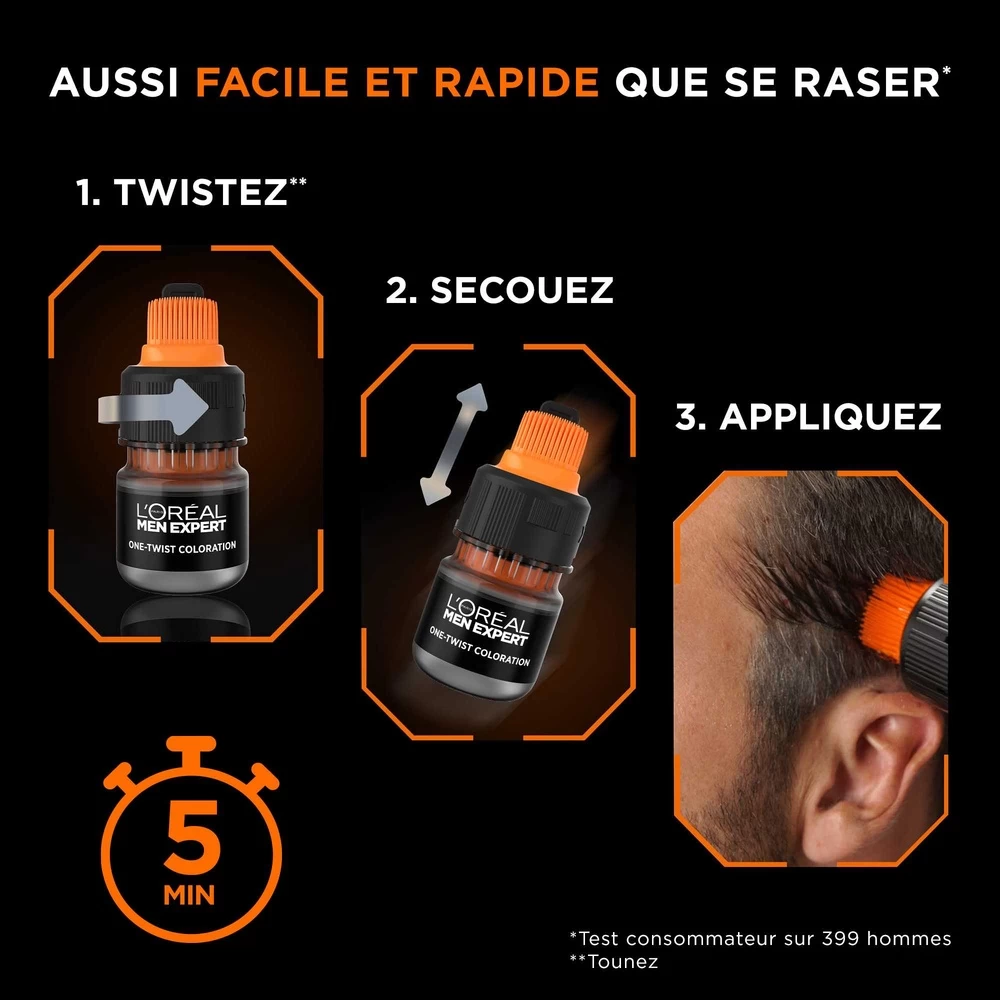 Spécialement conçue pour les hommes, la nouvelle technologie One-Twist coloration couvre vos cheveux blancs en 5 minutes seulement. Une application facile, rapide et inratable pour un résultat naturel indétectable qui s’estompe en 6 semaines.