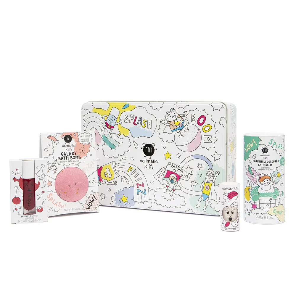1 vernis blanc nacré Zoulou formulé à l’eau + 1 brillant à lèvres rollette à lacerise + 1 boule de bain effervescente Galaxy + 1 bain moussant lagon