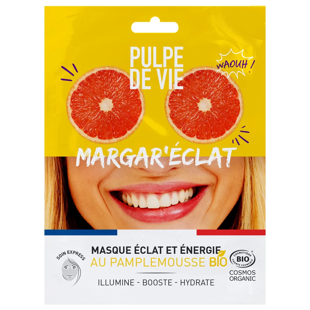 Un masque visage hydratant en tissu de coton BIO et biodégradable au pamplemousse BIO.