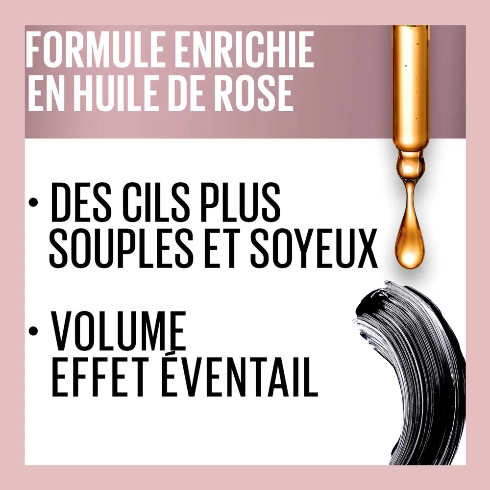 Un mascara volume effet éventail, enrichi en pigments extra-noirs, pour des cils démultipliés d’un coin à l’autre de l’œil. Sa brosse, avec 6 tailles différentes de picots, attrape, révèle et volumise le moindre cil. Enrichie en huile de rose et allégée en cire, sa formule légère enrobe chaque cil d’un volume sans paquet et d’une couleur noire intense. Résultat : les cils sont plus souples et soyeux, parfaitement définis, sans effet matière. Une application douce et facile pour des cils allongés et démultipliés, jamais cartonnés, jamais figés.