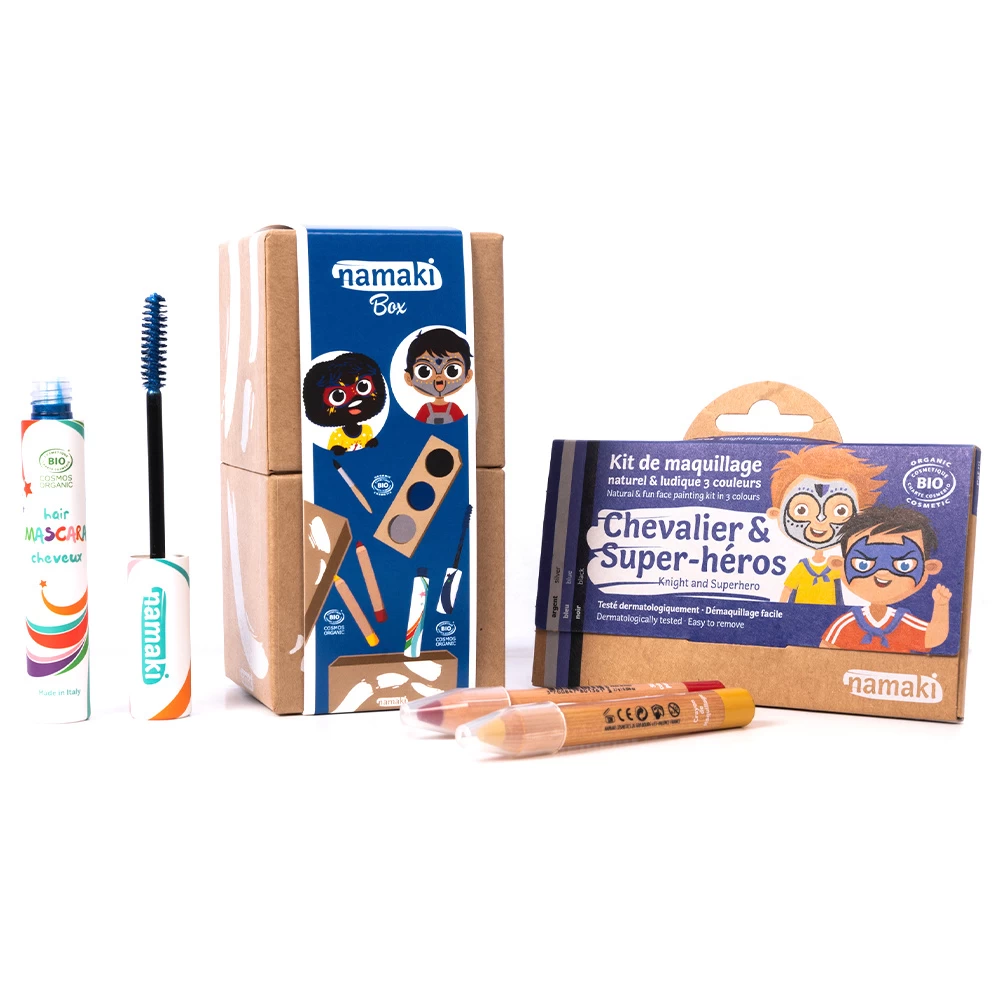 Découvrez les essentiels de Namaki dans deux nouvelles box thématiques pour permettre aux enfants de déborder de créativité dans leur maquillage de déguisement ! La Namaki Box Intergalactique contient : – 1 Kit 3 couleurs Chevalier & Super-héros – 1 Mascara cheveux Bleu – 1 Crayon de maquillage Rouge – 1 Crayon de maquillage Jaune