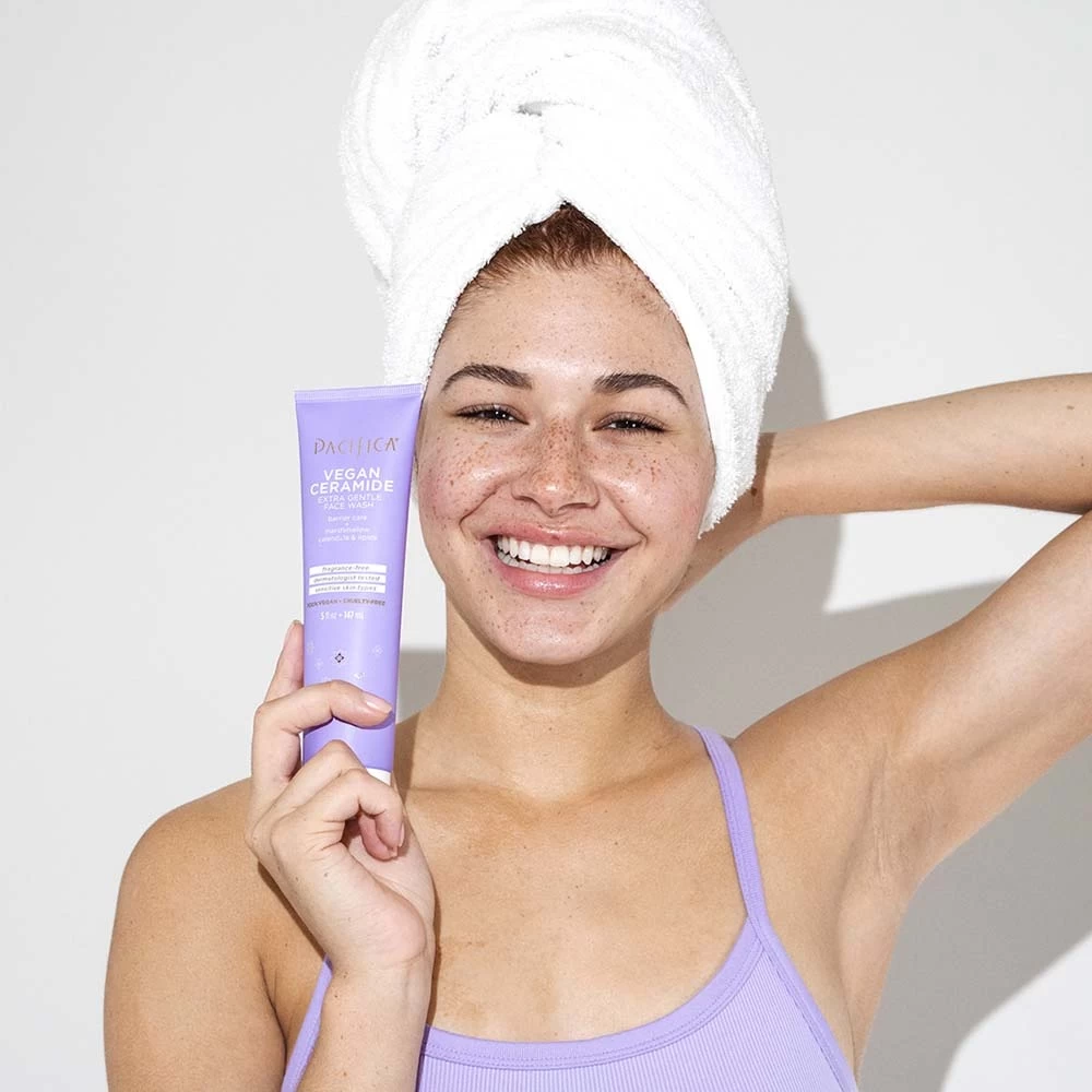 Adapté aux peaux sensibles, ce nettoyant visage très doux, sans parfum, et testé par des dermatologues, utilise des céramides véganes pour renforcer la barrière cutanée tout en éliminant maquillage, sébum et impuretés.