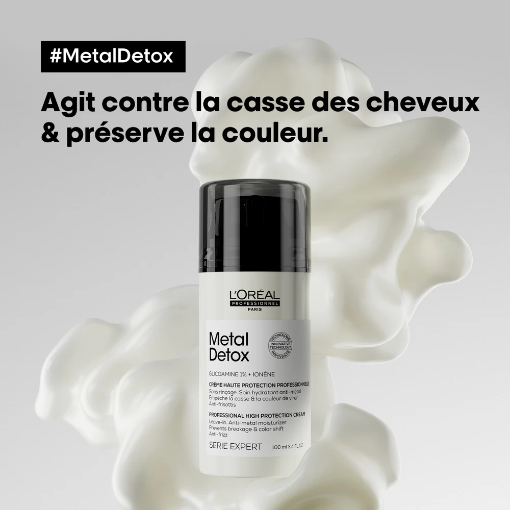 [INNOVATION BREVETÉE] Enrichie en Glicoamine, la crème pour cheveux sans rinçage Metal Detox élimine les métaux* et offre une protection contre le dépôt de nouvelles particules, afin d’agir contre la casse et préserver la couleur de vos cheveux. [HAUTE PROTECTION] Formulée avec des filtres UV, la crème haute protection Metal Detox de L’Oréal Professionnel protège les cheveux contre les dommages causés par les UV, l’oxydation, le brossage et la chaleur jusqu’à 230°C**. [HYDRATATION INTENSE ET ANTI-FRISOTTIS] Ce soin sans rinçage pour cheveux colorés ou naturels vous offre 72 heures d’hydratation et de contrôle des frisottis**, même à des niveaux d’humidité élevés. 3x plus de définition**. [COULEUR ÉCLATANTE] Les cheveux sont plus brillants et leur couleur est plus intense. 97% de l’éclat de la couleur est préservé après 8 semaines**. [FORMULE PROFESSIONNELLE] Sa texture fondante est instantanément absorbée par la fibre et enrobe les cuticules pour une meilleure protection de vos cheveux et un résultat tout en légèreté. [RECOMMANDÉE POUR TOUS TYPES DE CHEVEUX] Convient aux cheveux courts ou longs, méchés, bouclés. Pour les cheveux colorés, abîmés, cassants, secs, éclaircis et naturels.*Test instrumental après 10 applications.