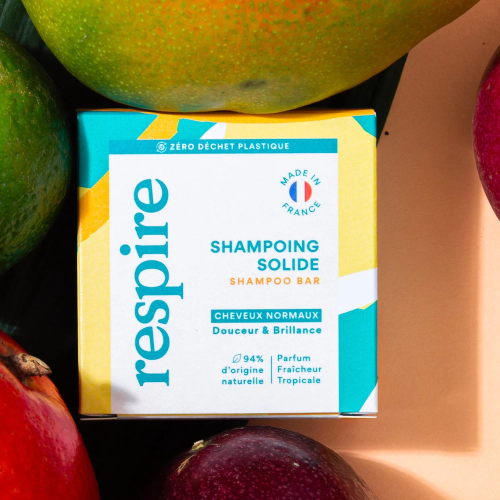 Le shampoing solide Fraîcheur Tropicale Respire est à 94% d’origine naturelle, vegan, fait en France et éco-responsable. Adapté aux cheveux normaux, il apporte douceur et brillance, laissant un parfum aux notes fruitées et acidulées. Sa formule est enrichie en huile d’amande douce bio, huile de cameline bio et huile d’avoine reconnues pour leurs propriétés nutritives et adoucissantes. Convient aux femmes enceintes.