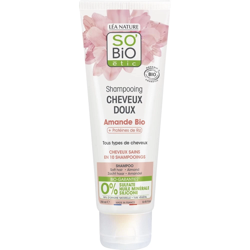 Pour des cheveux doux ce shampooing à l’Amande Bio & Protéines de Riz va gainer la fibre capillaire. Ils sont respectés quelque soit le type de cheveux. Ils retrouvent éclat et douceur ! Les Laboratoires Léa Nature ont développé une gamme de capillaires So’Bio étic respectueux de l’environnement et de la nature de vos cheveux. Formulés SANS SULFATE** ils intègrent un complexe spécifique à base de résine végétale pour permettre une action tout en douceur. En 10 shampooings, votre chevelure retrouve son éclat naturel sans agresser votre cuir chevelu. SANS SULFATE. SANS SILICONE. Formule biodégradable. Contenance : Tube de 250 ml – 10,1 fl.oz.