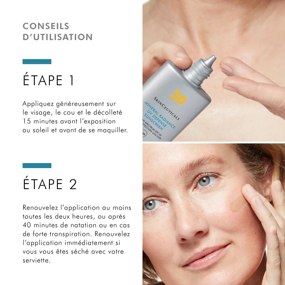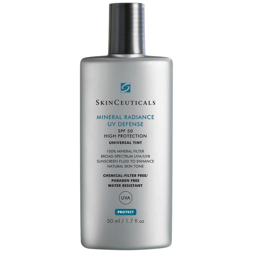 Fluide solaire teinté doté de filtres UV 100 % minéraux, Mineral Radiance UV Defense SPF 50 de SkinCeuticals renferme du dioxyde de titane micronisé capable de protéger efficacement la peau contre les UVA et les UVB.