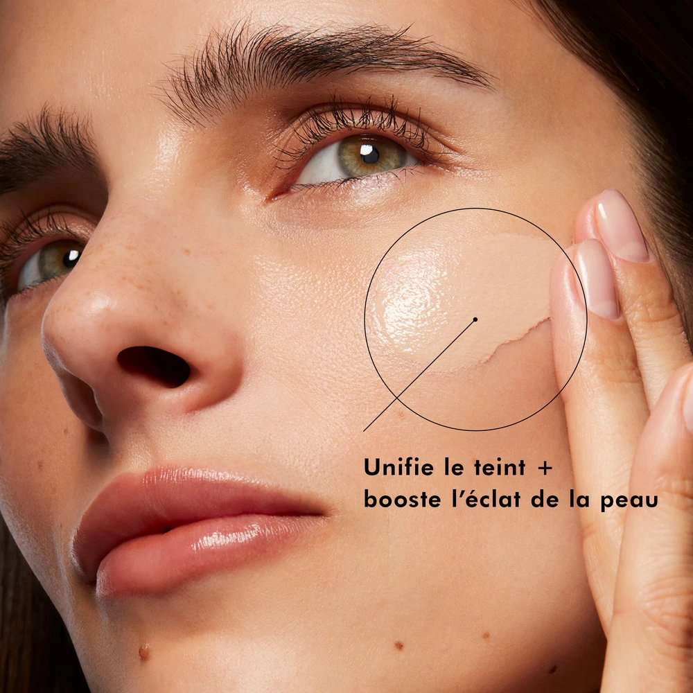 Des sphères translucides colorées unifient le teint et révèle l’éclat de la peau.